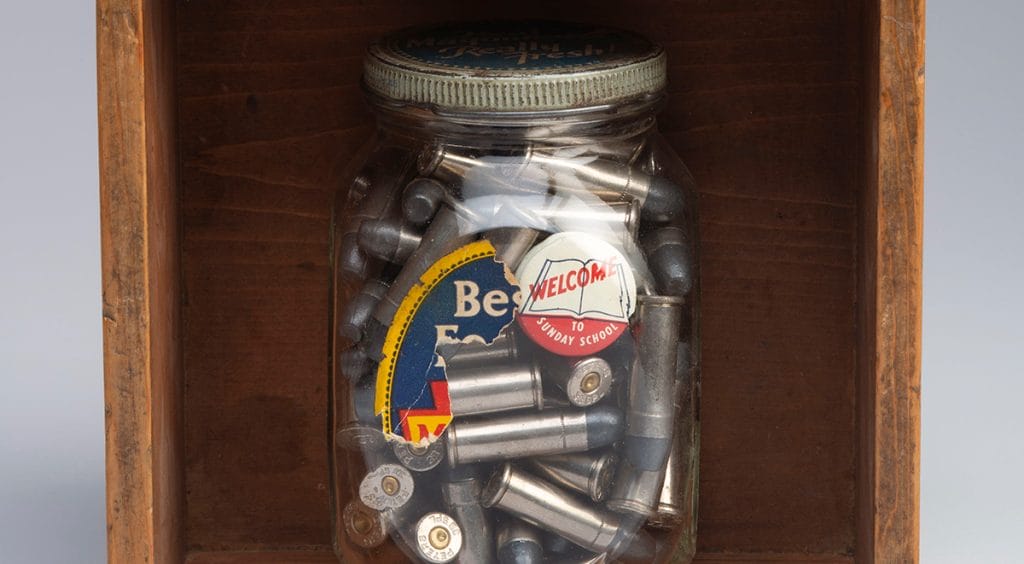 Welcome to Sunday School (2024) takes on another urgent topic: gun violence in spaces once considered sanctuaries. The assemblage critiques how churches, traditionally symbols of safety and moral guidance, have become sites of tragedy in America’s gun crisis. For Clint, the church of his youth was a protective haven, a place where the outside world’s chaos seemed far away. This idyllic perception now clashes with the reality of metal detectors at church doors and a lack of meaningful gun reform.