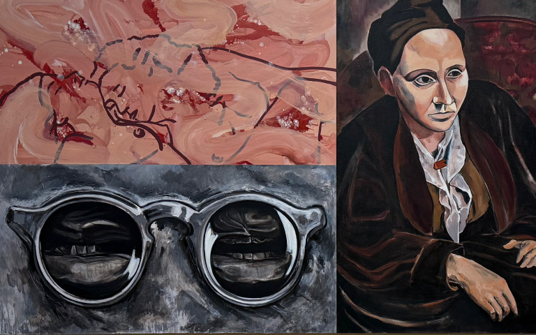 Kass’s work is most pointed when she focuses on lesbian or queer identity. Two of some of the most famous images of lesbians in Modern art are combined with a more fluid, all-over abstract style in “How Do I Look” (1991), along with Jasper Johns’s “The Critic Sees” (1961), in which Johns swaps a critic’s bespectacled eyes with mouths. The coital French women are drawn atop rosy swirls, as a serious Gertrude Stein looks out from her Picasso-painted portrait. Everything is rendered in high contrast, and the austere public persona of the Jewish-American intellectual dominates the portrayal of same-sex love. While Stein was openly lesbian at a time when prohibitions against being out existed, Johns has always been more coy about his own sexuality, even decades after Stein’s death. It also brings up the question: When we walk through a museum, do we even recognize queerness? This portrait of lesbian passion was painted by a straight man, yet it is the most identifiably LGBTQ+ image for the visitor. “Are we actually looking?” Kass asks, or, like Johns’s slam against critics, are we unable to see while we continue to speak?