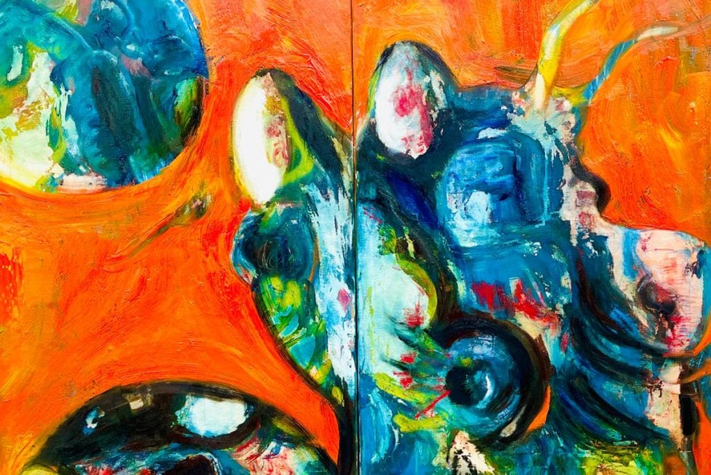 This oil-on-canvas diptych, measuring 120 cm by 120 cm, is a striking exploration of contrast and chaos. Dominated by vibrant blue and orange, the colors seem to clash and harmonize simultaneously, pulling the viewer into a storm of emotions. The central figures—a creature with ambiguous, animal-like features—emerge from the swirling hues, suggesting a state of transformation or unrest.