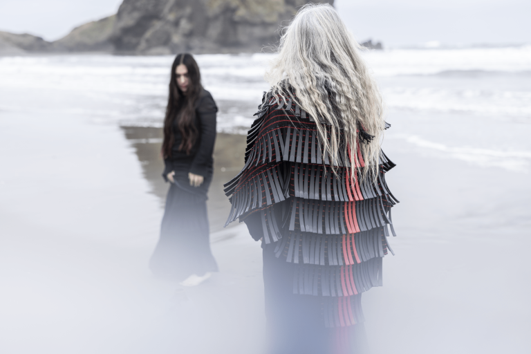 The commissioned installation, The Seer, the Seen, the Seeing, is comprised of three main elements: a kākahu (cloak), made of kiln-formed glass and woven fibers; a puru hau (sacred ritual vessel) in blown glass; and a film. The cloak and vessel are key components of a filmed ceremony centering Kirkwood and her father, set against the backdrop of their ancestral lands at Piha Beach on New Zealand’s west coast.