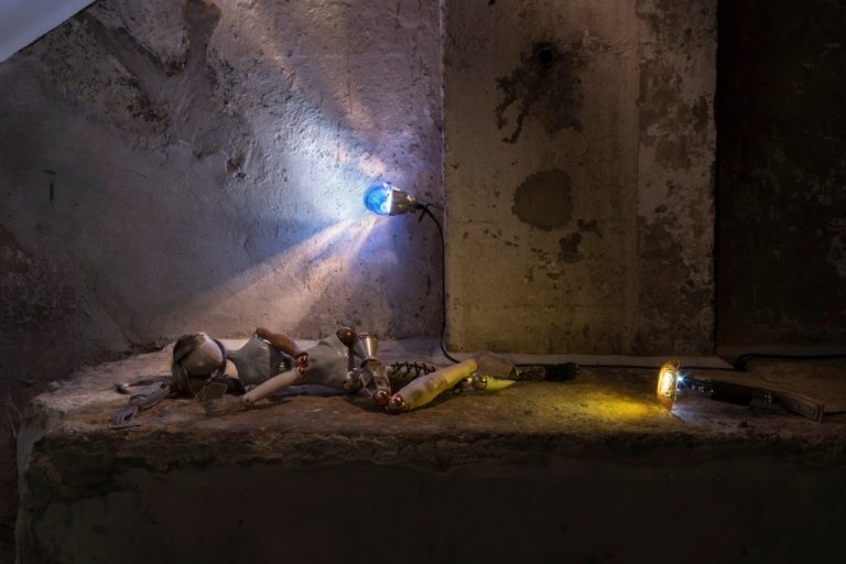 For “Ideal Space for Music,” which runs until March 24, ASMA used SculptureCenter’s basement to reflect on the subconscious, a consistent theme over the course of their nine-year collaboration (which is perhaps unsurprising considering Armendaris’s mother’s career as an art therapist). The exhibition includes a series of metal spheres, a video work, soundscapes, ink paintings, and light fixtures made from found objects, transforming the cold concrete space into a bunker of the mind, a post-traumatic landscape of the collective psychology in which the dolls reside.